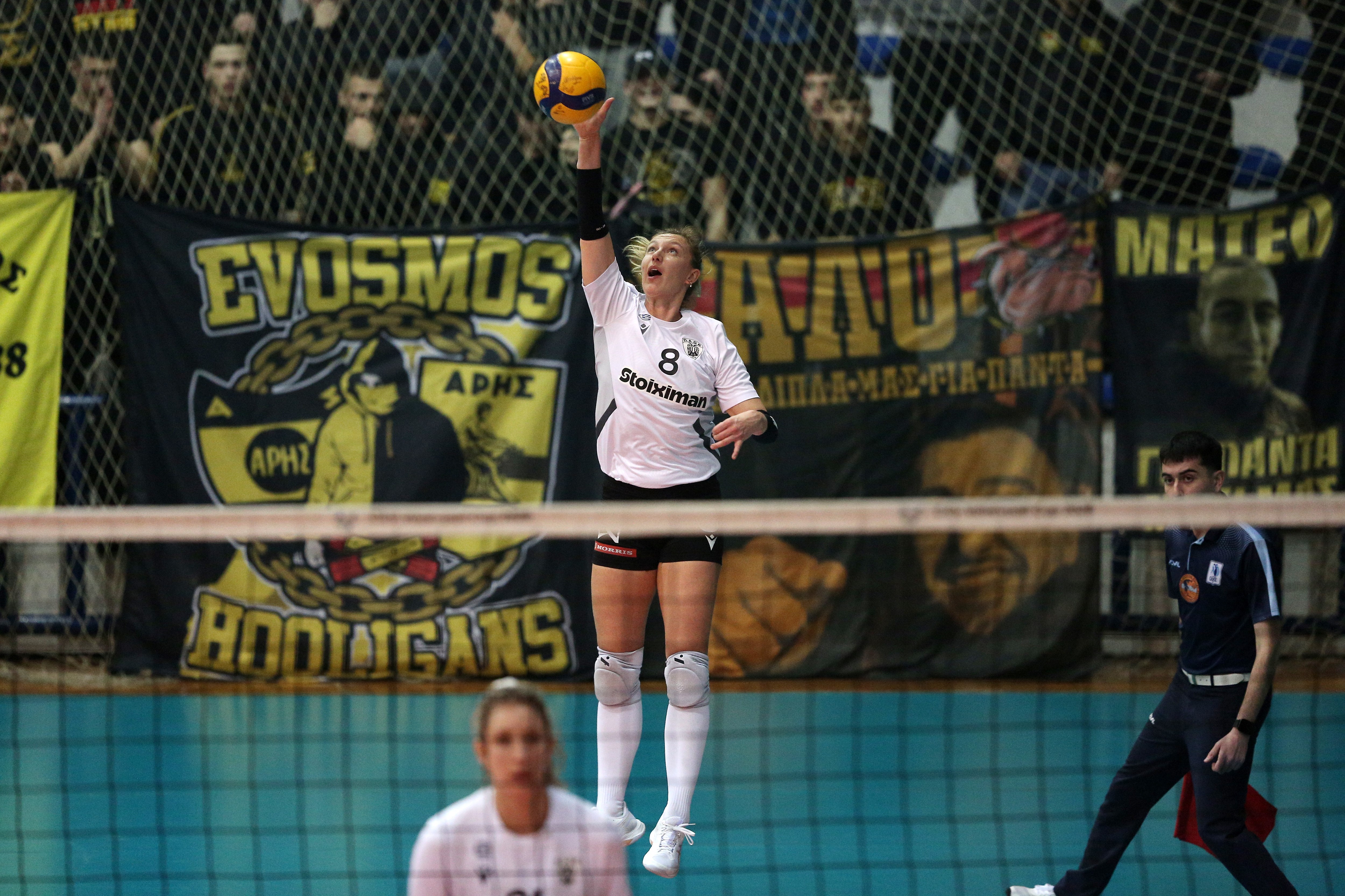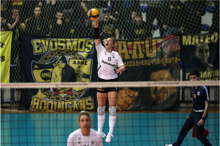 Οι κιτρινόμαυρες ξεκίνησαν καλύτερα το δ' σετ, καθώς προηγήθηκαν 4-2, ωστόσο όλα κρίθηκαν στο 8-8. Η Τάουμπνερ πήρε την αλλαγή, η Τοντάι πήγε στο σερβίς και έφυγε όταν το σκορ είχε διαμορφωθεί σε 8-14. Ο Άρης δεν μπόρεσε να βρει τρόπο να επιστρέψει και ο Δικέφαλος βρέθηκε στην 8αδα.