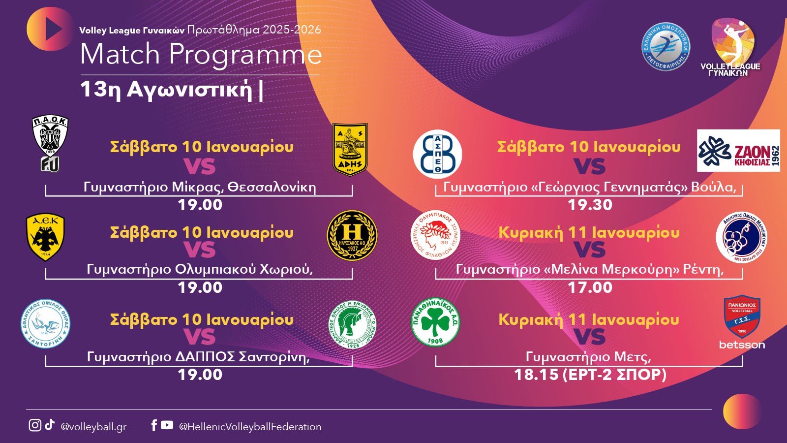 Το πρόγραμμα της 13ης αγωνιστικής θα ολοκληρωθεί στο κλειστό του Μετς, με τον αήττητο Παναθηναϊκό να φιλοξενεί τον τρίτο της βαθμολογίας Πανιώνιο. Οι δύο ομάδες προέρχονται από εκτός έδρας νίκες στο Challenge Cup, που τους δίνουν προβάδισμα πρόκρισης στα προημιτελικά της διοργάνωσης, ενώ στον αγώνα του πρώτου γύρου οι πράσινες είχαν επικρατήσει με 3-2 σετ στη Νέα Σμύρνη.