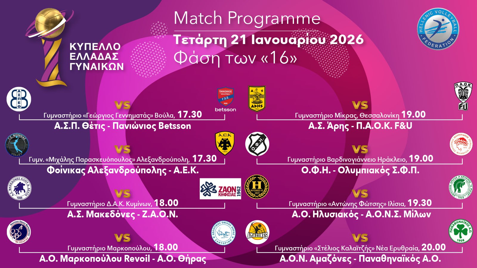 Με τη φάση των «16» συνεχίζεται η δράση στο Κύπελλο γυναικών 2025-2026, με τις ομάδες της Volley League γυναικών να μπαίνουν στο... κόλπο.