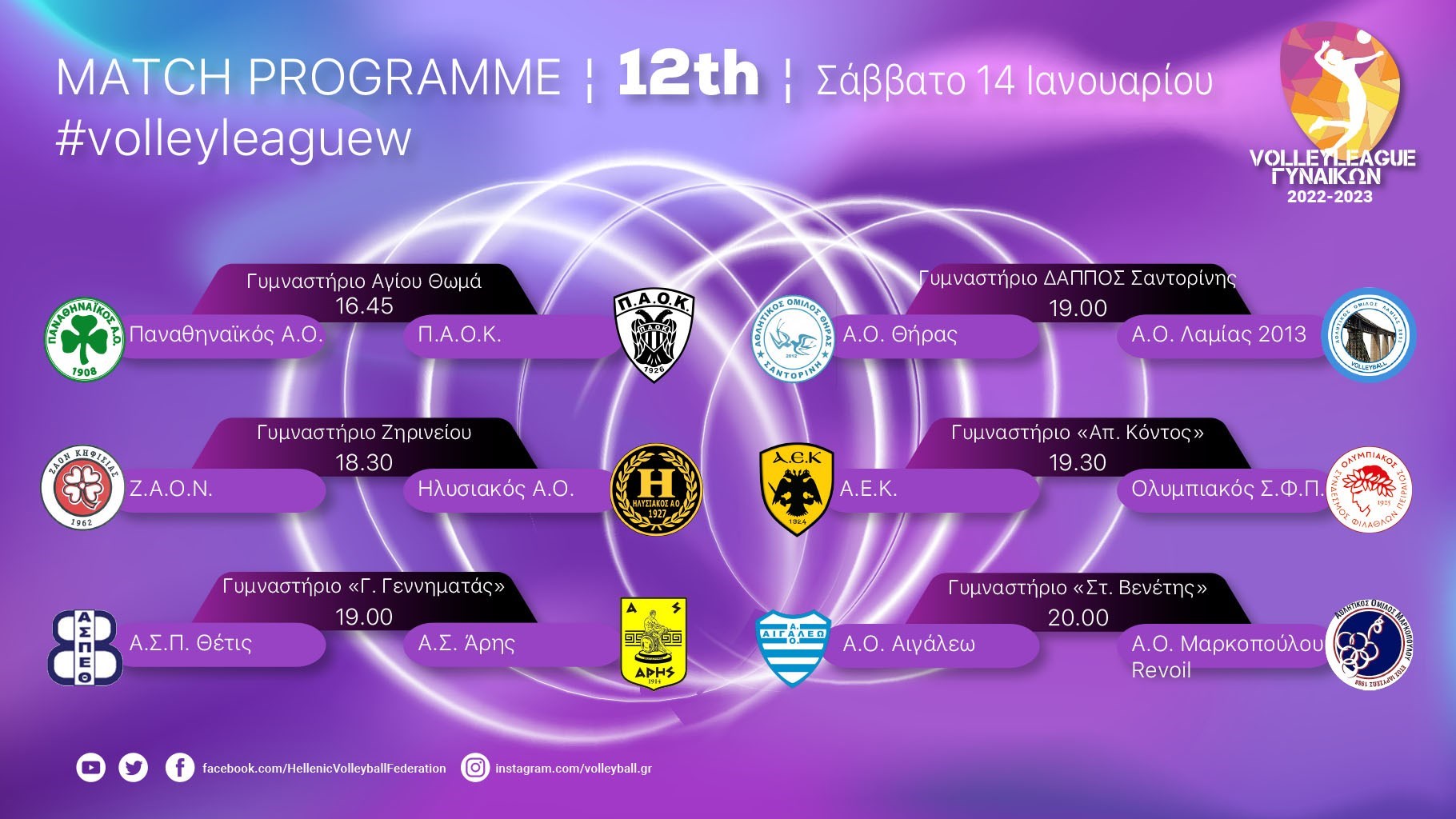 Γυμναστήριο «Στ. Βενέτης», 20.00: Α.Ο. Αιγάλεω - Α.Ο. Μαρκοπούλου Revoil
