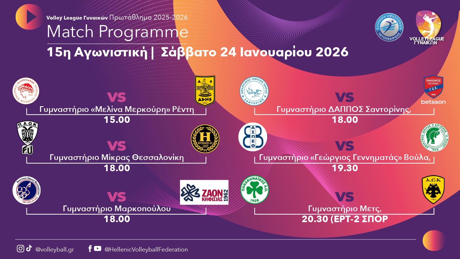 Το Σάββατο 24 Ιανουαρίου θα διεξαχθεί η 15η αγωνιστική του πρωταθλήματος της Volley League Γυναικών με ενδιαφέρουσες αναμετρήσεις που μπορεί να αλλάξουν τις ισορροπίες στον βαθμολογικό πίνακα.