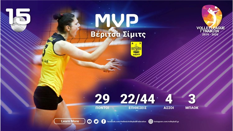 Η Βέριτσα Σίμιτς είναι η MVP της 15ης αγωνιστικής του πρωταθλήματος της Volleyleague γυναικών. Η Βόσνια διαγώνια του Άρη ήταν η κορυφαία στην επικράτηση με 3-2 σετ στην έδρα του Πορφύρα, στην 8η φετινή νίκη της ομάδας της. Πέτυχε 29 πόντους με 22/44 επιθέσεις (50%), 4 άσσους και 3 μπλοκ.